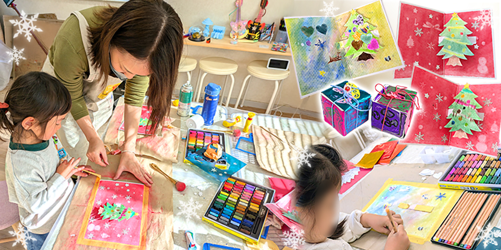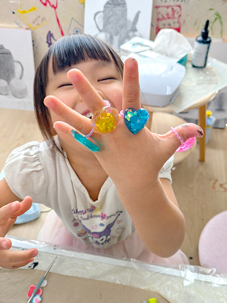 小学生クラスは光や影、色の法則などを学ぶ日があります。一方、幼少クラスは絵具やパステル、粘土などさまざまな画材を使い、色を自由に選び、時には体や五感を使って楽しむ内容です。好きなことに集中する力を大切にし、最後までやりきる楽しさを育んでいます。